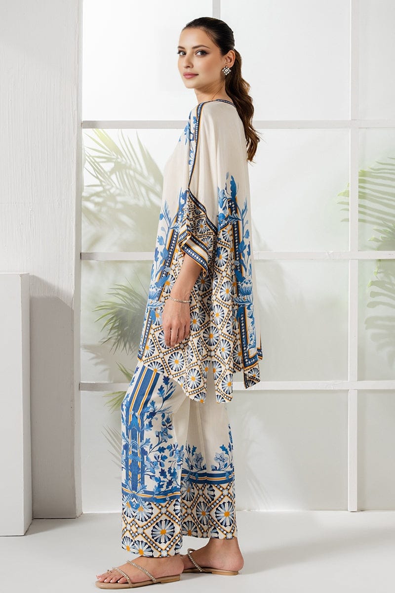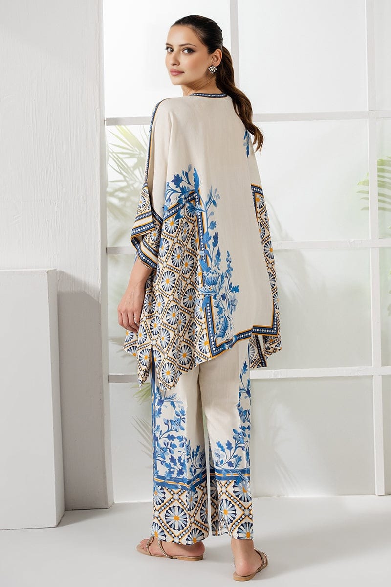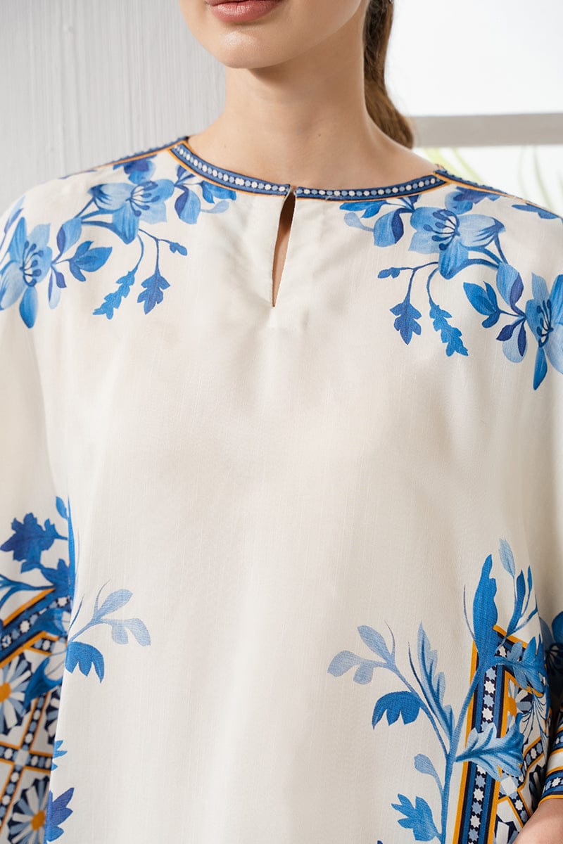 Ivory & Blue Garden Artwork Print Unstitched Suit