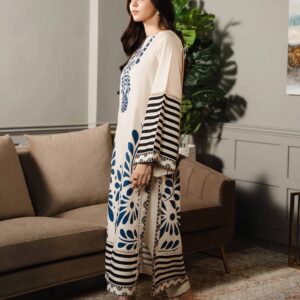 The serene cream base enhanced by delicate blue floral prints evokes effortless grace and sophistication. Whether styled for daytime gatherings, festive occasions, or casual outings, this suit effortlessly blends tradition with contemporary design for a versatile and refined look.