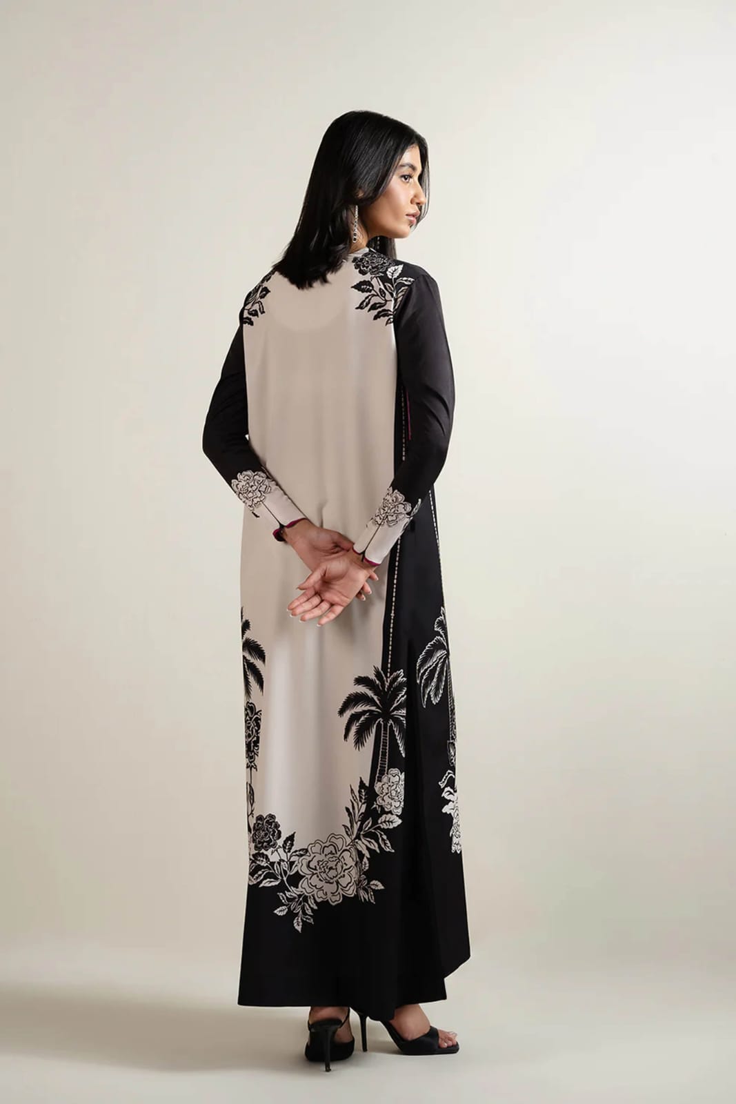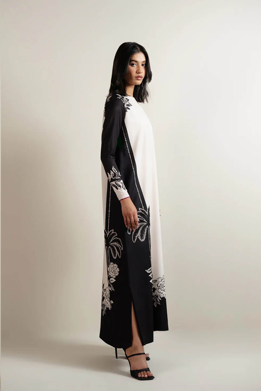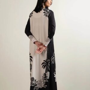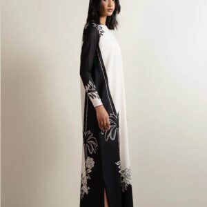 The contrasting palette of rich black and serene cream is brought to life through artistic prints and refined detailing, offering a versatile design that transitions beautifully from casual daytime styling to evening gatherings. Whether crafted into a sleek straight cut or a graceful A-line silhouette, this suit material brings a signature aura of elegance to every occasion.