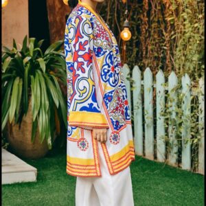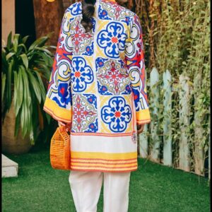 Pair this suit with minimal accessories and neutral footwear for a balanced daytime look, or elevate it with bold jewelry for evening charm. The Vibrant Mosaic Art Printed Unstitched Suit blends creativity and elegance, making it a standout addition to your curated ethnic wardrobe.
